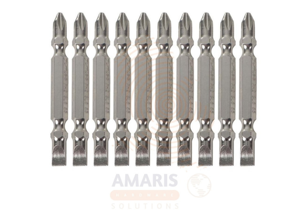 A Double – End Bits Set slotted is a collection of screwdriver bits featuring slotted (flathead) tips on both ends, designed for use with power drills, screwdrivers, and bit holders. These bits are typically made from durable steel alloys, offering long-lasting performance and resistance to wear. The double-ended design allows for extended use and quick flipping between ends when one becomes worn, increasing convenience and efficiency. Slotted bits are ideal for fastening or loosening screws with straight, single-groove heads commonly found in woodworking, electrical applications, and general-purpose repairs.